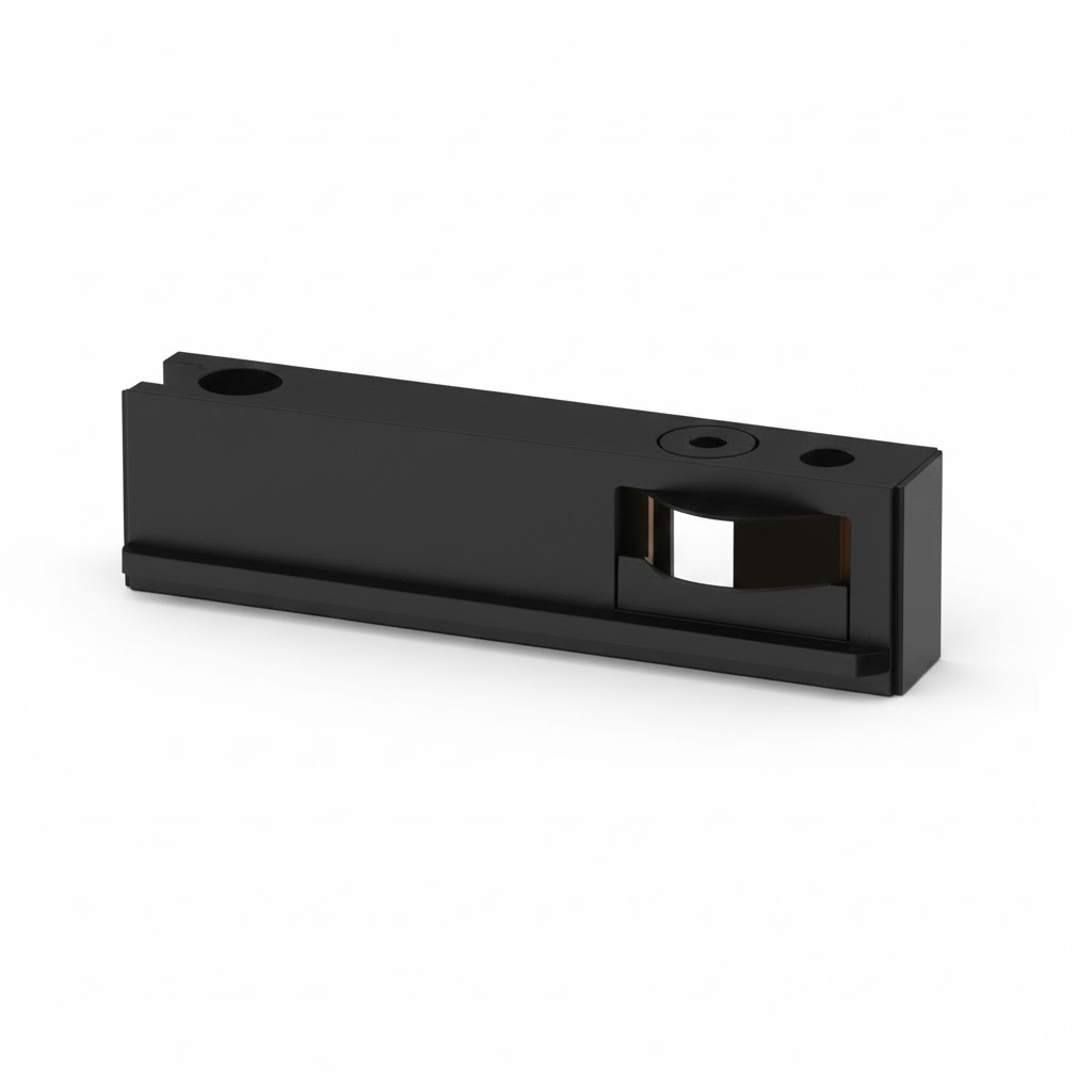 Это монтажный элемент, предназначенный для подключения трековых светильников к шинопроводу (трековой системе). Выполнен в чёрном цвете, имеет компактную угловую конструкцию с крепёжными отверстиями и фиксирующим механизмом.