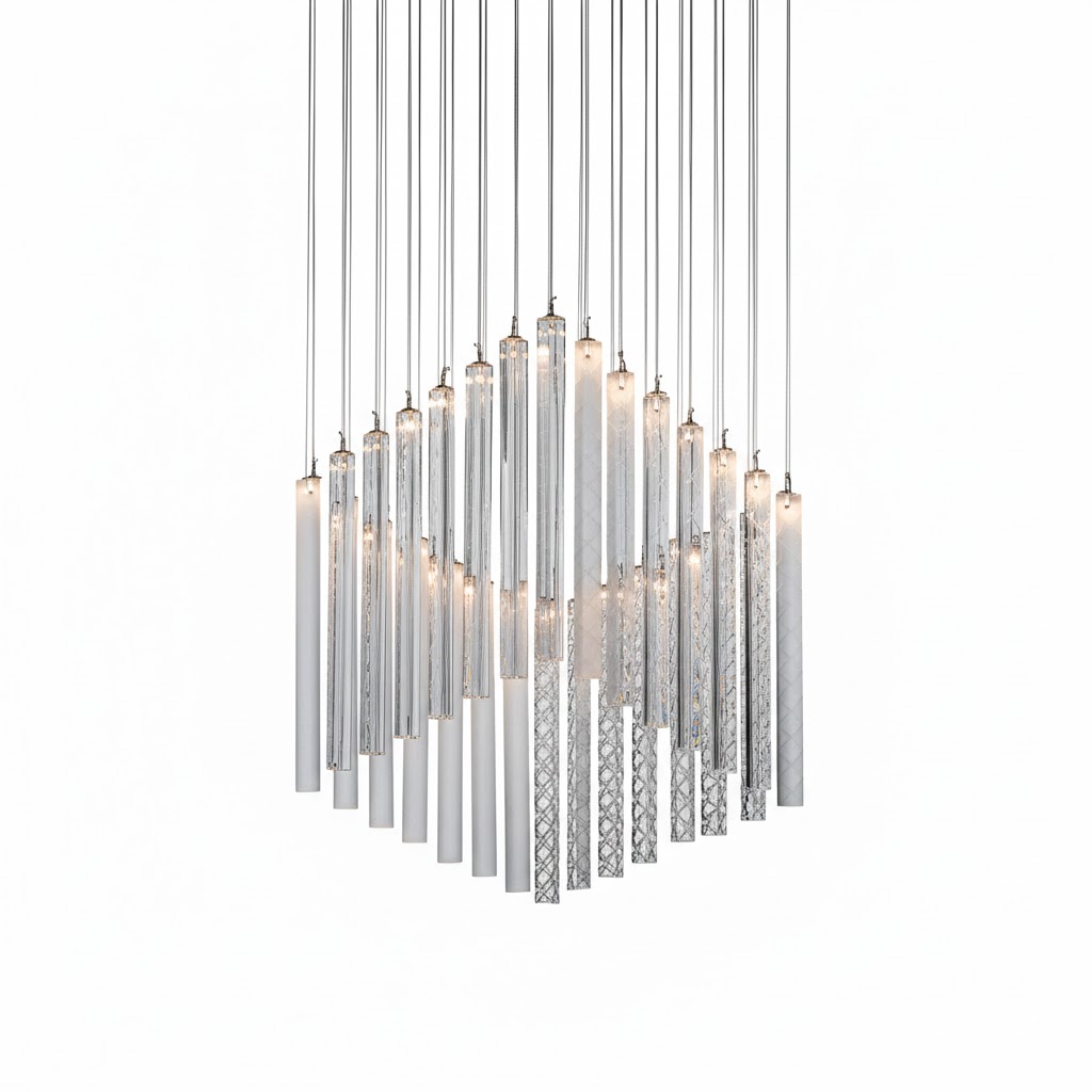 Люстра представляет собой монументальную, но при этом воздушную композицию из множества хрустальных стержней, которые создают эффект сияющего облака, парящего в пространстве.