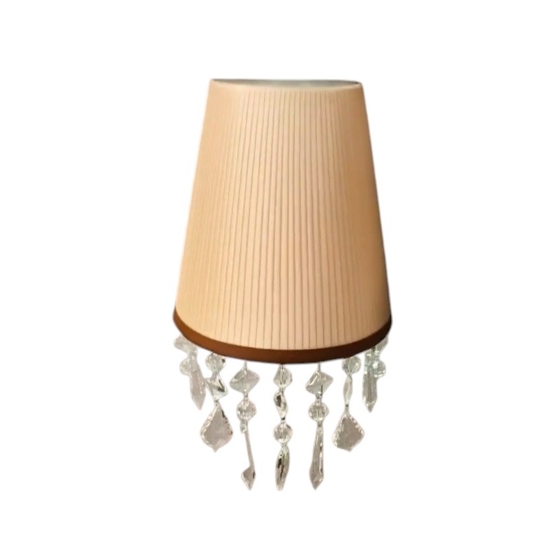 Настенный светильник (бра) KOSTEL by Romatti — изысканное сочетание классики и утончённого декора. Элегантный абажур конической формы выполнен в тёплом бежевом оттенке с рельефной текстурой, которая придаёт изделию особый шарм. Особенностью модели являются хрустальные подвески, изящно свисающие с нижнего края абажура, создающие игру света и добавляющие нотку роскоши.