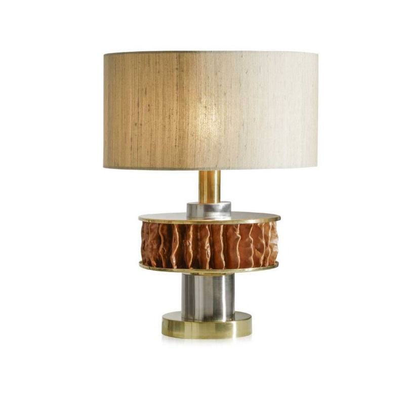 Настольная лампа SIGNA-L by Romatti — изысканное сочетание современного дизайна и утончённых материалов. Её конструкция привлекает внимание гармоничным сочетанием металлических элементов с золотистым и серебристым покрытием и выразительного декоративного кольца с фактурной поверхностью, напоминающей природные мотивы.