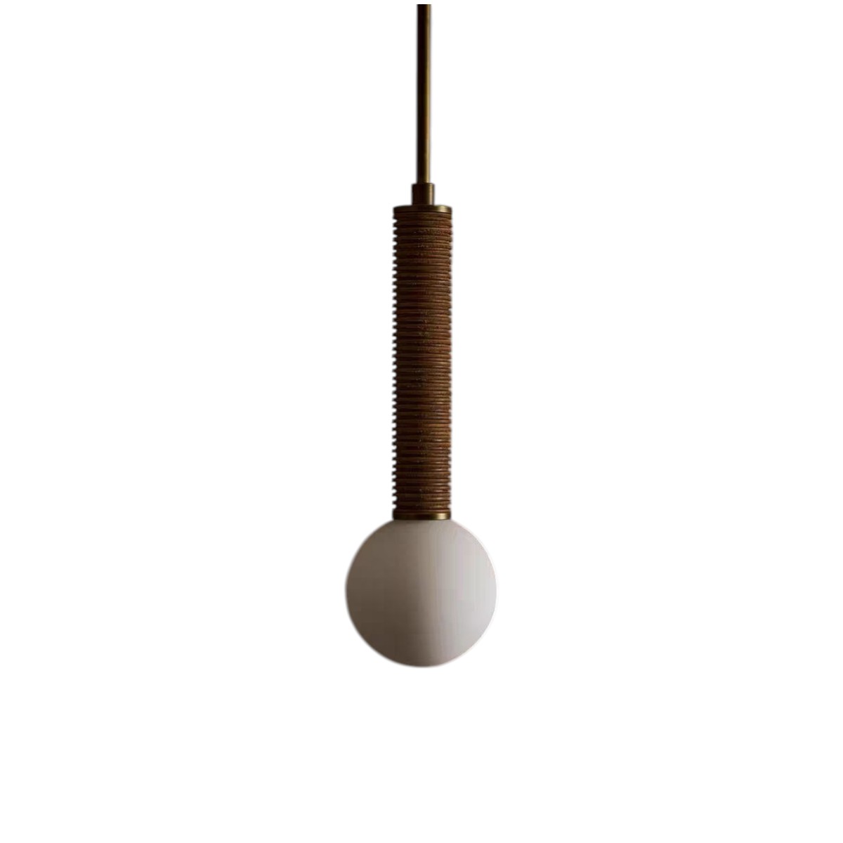 Дизайн модели построен на контрасте текстур и материалов: рельефный корпус из кожи насыщенного коричневого оттенка гармонично сочетается с матовым стеклянным плафоном в форме шара. Латунные элементы крепления добавляют изделию нотку элегантности и тепла. Вертикальная композиция и чёткие линии подчёркивают современный характер светильника, при этом его облик не выглядит излишне строгим — благодаря мягким формам плафона и фактуре корпуса.