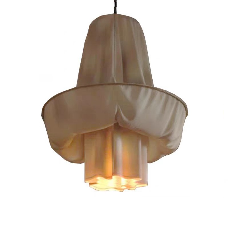 Особенность светильника — многослойная структура: несколько ярусов ткани, аккуратно уложенных друг над другом, формируют объёмную композицию. Такая конструкция не только эстетична, но и функциональна: она мягко рассеивает свет, устраняя резкие блики и создавая уютную атмосферу. Подвесная система лаконична и не отвлекает внимание от основного дизайна.
