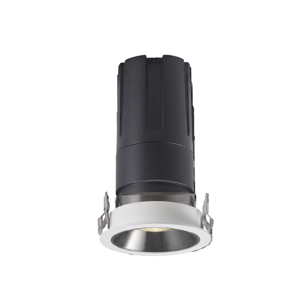 Конструкция светильника выполнена с упором на надежность и эффективное управление теплом. Верхняя часть корпуса оснащена развитым алюминиевым радиатором, который предотвращает перегрев светодиода, обеспечивая стабильную работу на протяжении многих лет. Благодаря компактным размерам и простой системе пружинных креплений, модель легко монтируется в подвесные или натяжные потолки, позволяя органично распределить свет даже в помещениях с ограниченным запотолочным пространством. Это универсальный инструмент для тех, кто ищет баланс между эстетикой скрытого монтажа и профессиональным качеством освещения.