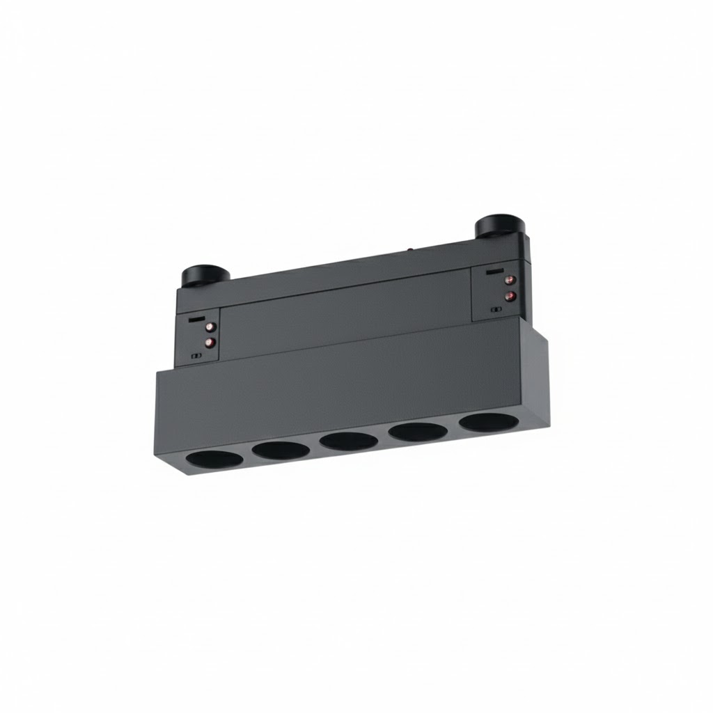 Конструкция светильника выполнена в виде прямоугольного корпуса с несколькими круглыми отверстиями для установки трековых источников света. Такая компоновка обеспечивает равномерное распределение света и даёт возможность гибко настраивать световые сценарии — от акцентного освещения до общего равномерного света.