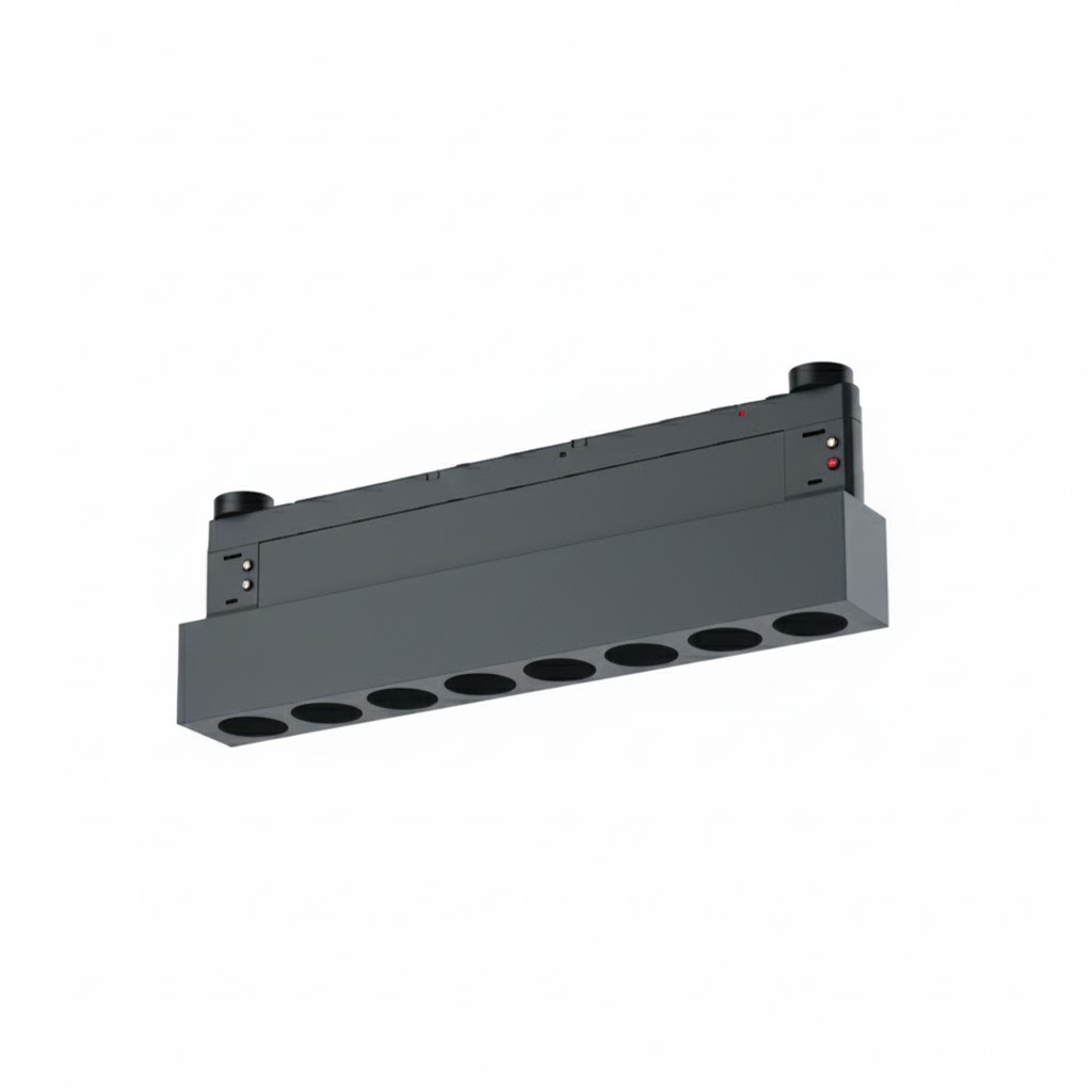 Конструкция светильника выполнена в виде прямоугольного корпуса с несколькими круглыми отверстиями для установки трековых источников света. Такая компоновка обеспечивает равномерное распределение света и даёт возможность гибко настраивать световые сценарии — от акцентного освещения до общего равномерного света.