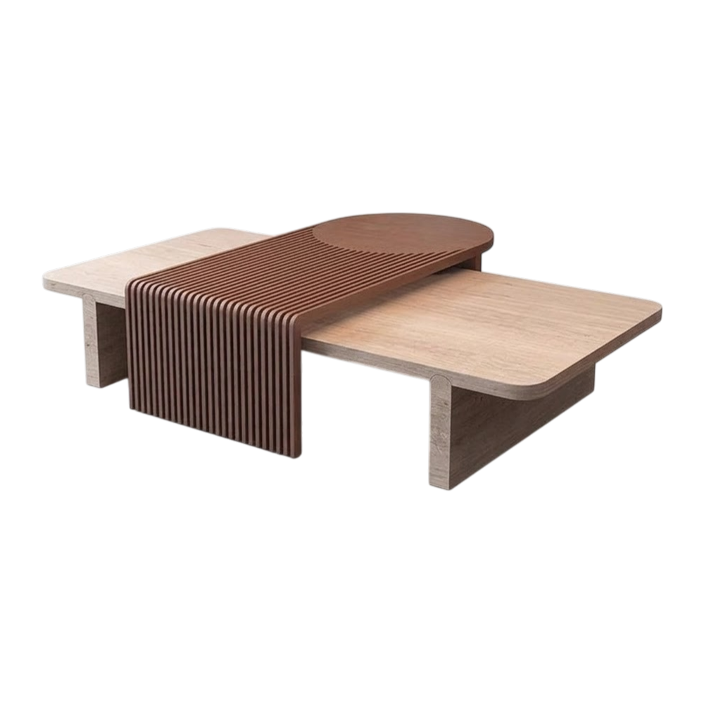 Журнальный столик AEROFLEX by Romatti — пример современного дизайна, в котором функциональность гармонично сочетается с эстетикой. Его необычная конструкция состоит из двух прямоугольных платформ, соединённых центральной декоративной вставкой с ритмичным рисунком из прорезей. Сочетание светлого и тёмного дерева создаёт выразительный контраст, а плавные линии и минималистичные формы делают столик универсальным элементом для любого интерьера — от скандинавского до современного лофта.